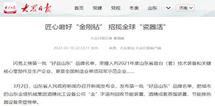 MORE早春三月增春意,金塔品牌添春色。 3月2日,山東省人民政府新聞辦召開(kāi)新聞發(fā)布會(huì),發(fā)布第一批“好品山東”品牌名單,共涵蓋14類(lèi),223家制造業(yè)、消費(fèi)品、農(nóng)產(chǎn)品領(lǐng)域品牌。首批入選品牌具有質(zhì)量水平高、社會(huì)知名度高、市場(chǎng)影響力大的鮮明特點(diǎn)。山東金塔機(jī)械集團(tuán)酒精化工設(shè)備公司“金”字溶劑回收節(jié)能裝置、酒精成套蒸餾裝置、節(jié)能換熱器設(shè)備榮登榜單。 好品質(zhì)鑄就好品牌。金塔集團(tuán)致力以品質(zhì)金塔建設(shè)推進(jìn)品牌強(qiáng)力提升,產(chǎn)品相繼榮獲山東優(yōu)質(zhì)品牌、山東知名品牌稱(chēng)號(hào),被授予“山東省制造業(yè)高端品牌培育企業(yè)”。品質(zhì)卓越,品牌彰顯,金塔品牌知名度、美譽(yù)度和公信力得到完美展現(xiàn),成為推進(jìn)高質(zhì)量發(fā)展的強(qiáng)大引擎。